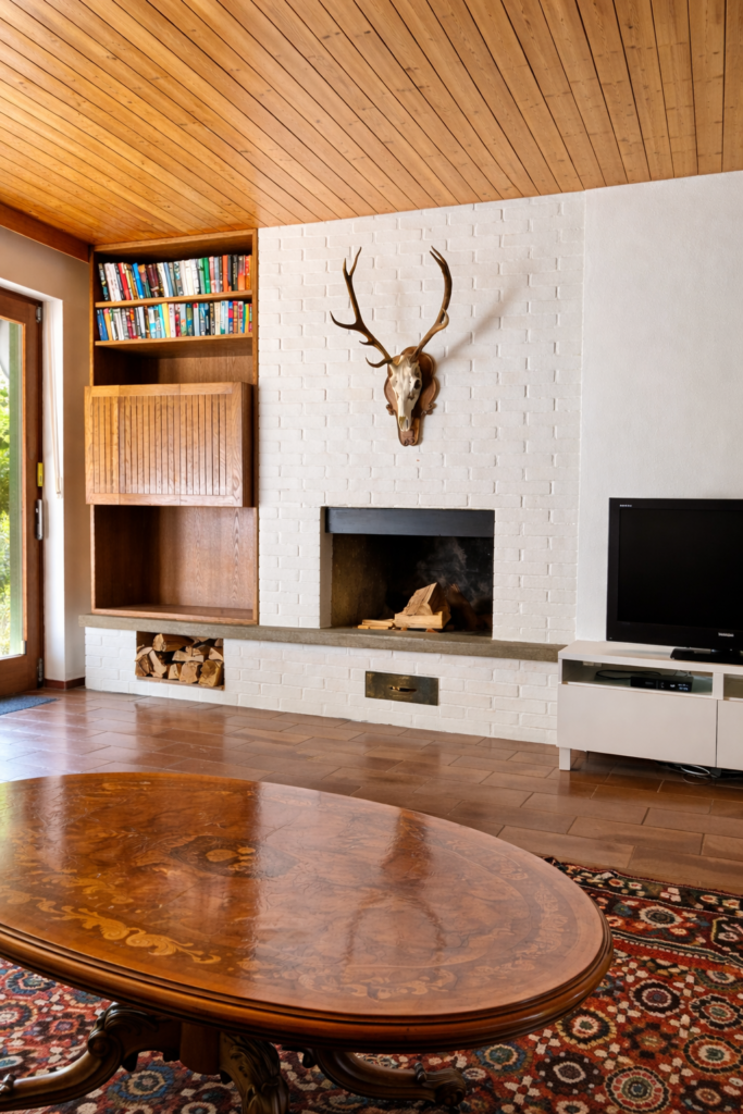Der Wohnbereich mit offenem Kamin, gemütlicher Sofaecke und Essbereich lädt zum Verweilen ein.