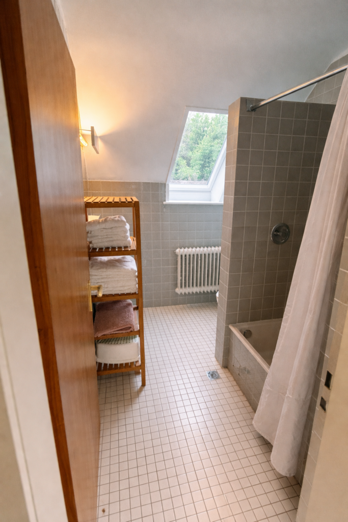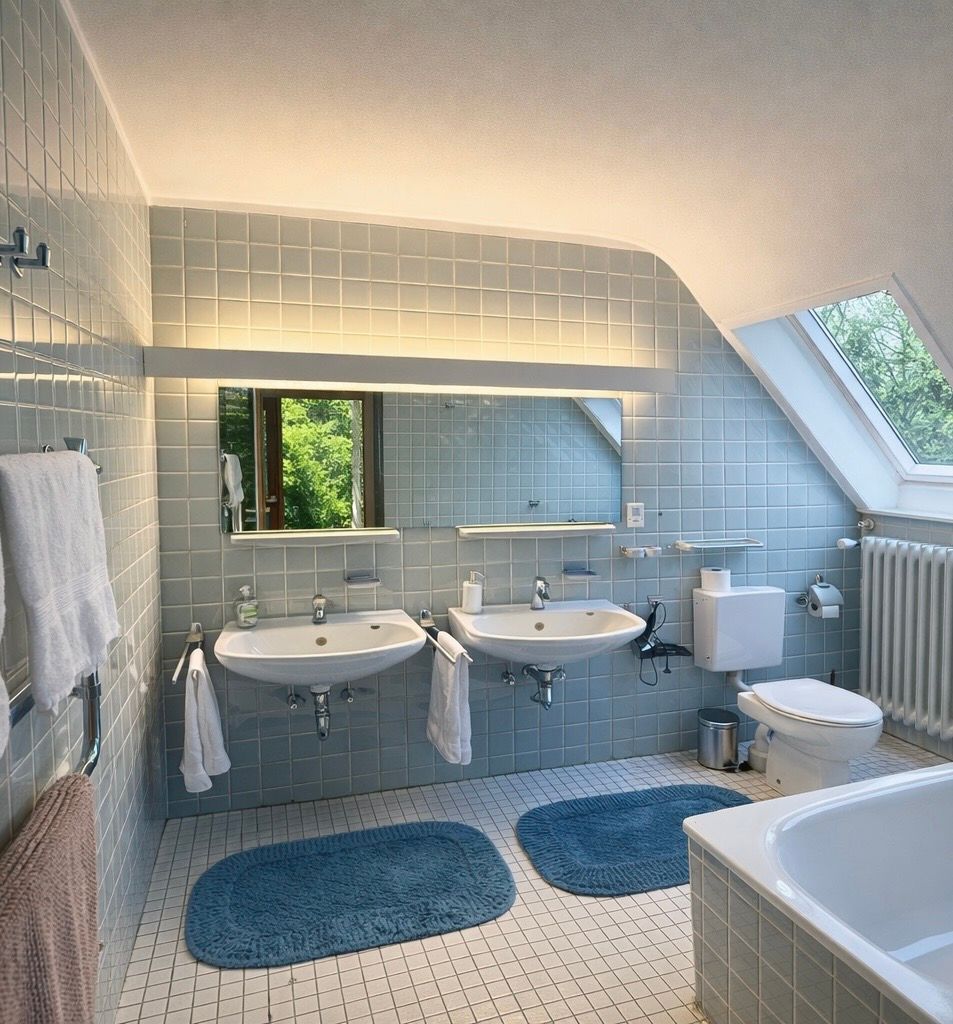 Dieses Bad ist mit Dusche, Badewanne und zwei Waschbecken ausgestattet.